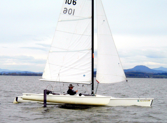 Check out all the lines coming to the helmsman. The foil control handle is in my left hand. I'm wearing a life jacket because the day before I capsized it. A friend in a Hunter 23 pulled us back over. It was very cold that March day and by the time I got back to the dock I was shivering so bad I couldn't tie a knot. At first I wanted to blame the boat for the capsize because the hydrofoil didn't hold the hull down on starboard tack, which is what I thought it was supposed to do. So I went out again. And capsized again. It's not like a Hobie. No pulling this back over yourself. Luckily, my buddy in the Hunter was shadowing me again. I was not a happy camper and was thinking I bought a terrible boat. Then I remembered: it's the lousy carpenter that blames his tools. So I contacted John Slattebo, the designer, and talked to him. Here's the deal: the hydrofoil only works when water is flowing over the surface, just like a rudder. The power the foil has goes up exponentially with the increase in speed. So when you are tacking, the boat is moving very slow, and the foil is basically just hanging there, 3 feet underwater, scaring the fishies. If a gust of wind comes at that moment, and you've got the mainsheet tight because you want to go fast, over you go. Time for swimming lessons, not sailing lessons. Solution: keep mainsheet slack through and after the tack. Gradually tighten as speed picks up. I haven't capsized since. |